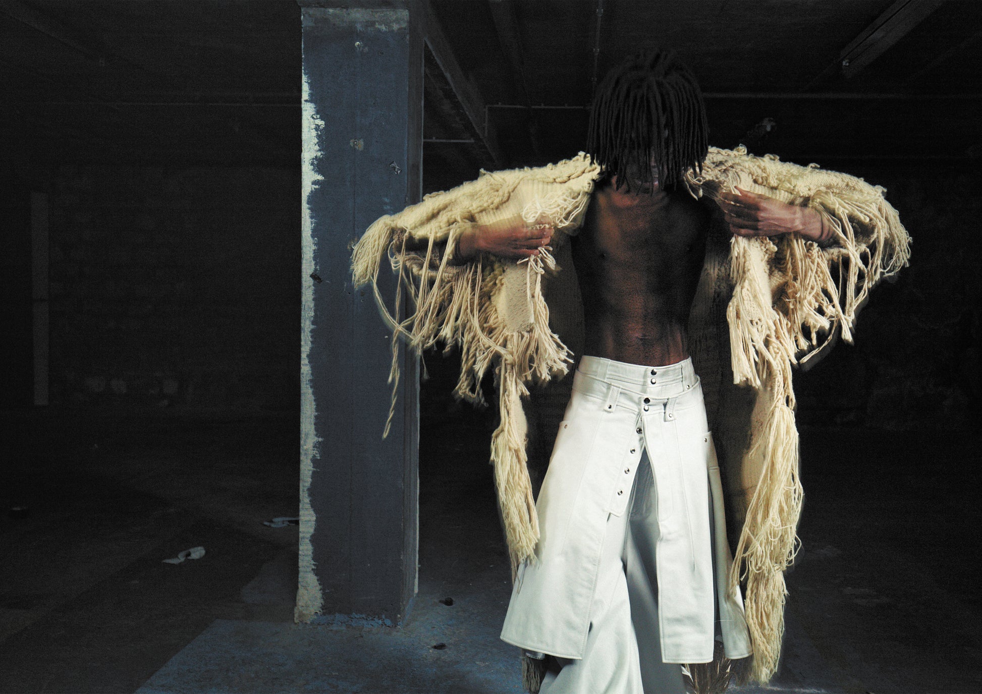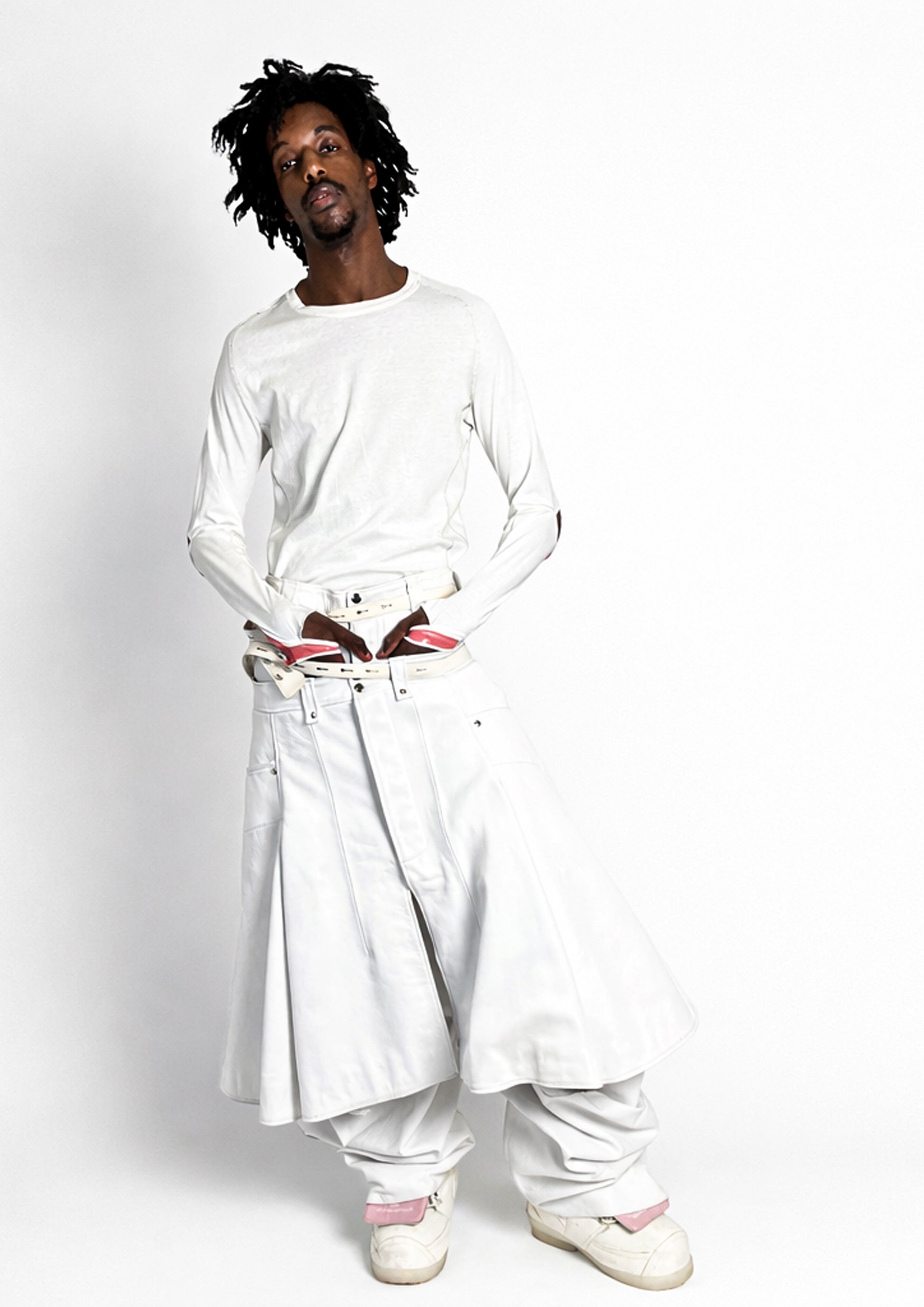 The sirwal ( = pants ) features a low crotch with merged pattern front and back pockets. The sirwal are a subtype of Harem pants which can be typically found in Tareet's home town in Guediawaye, Senegal .