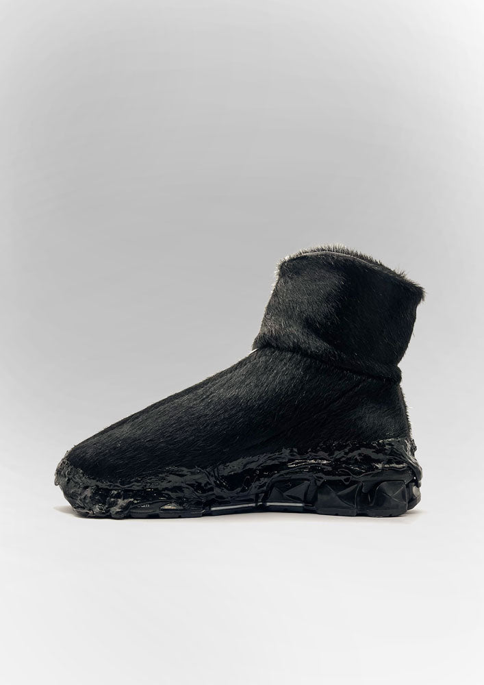 A SHATTERED DESTRUCTION OF ASICS WITHIN A BABOUCHE SHAPE THAT HAS BEEN HANMADE REWORKED.