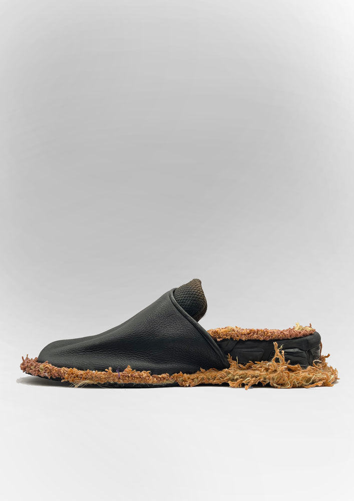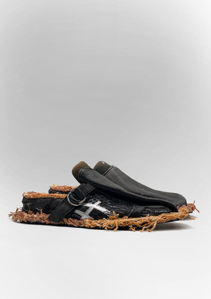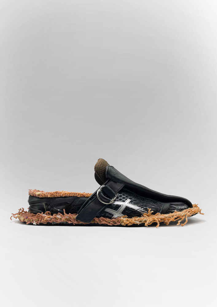 A SHATTERED DESTRUCTION OF ASICS WITHIN A BABOUCHE SHAPE THAT HAS BEEN HANMADE REWORKED WITH HERITAGE WEAVING.