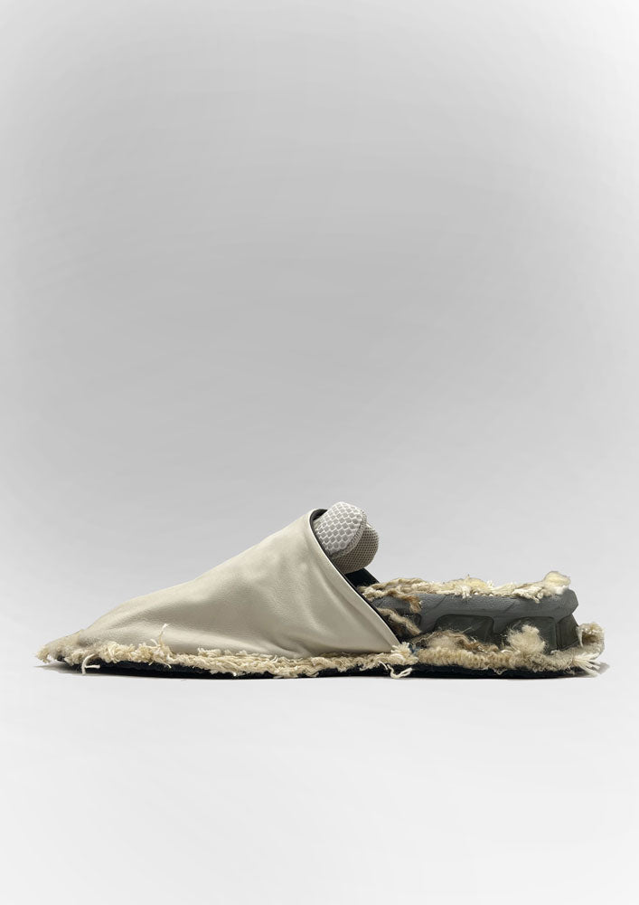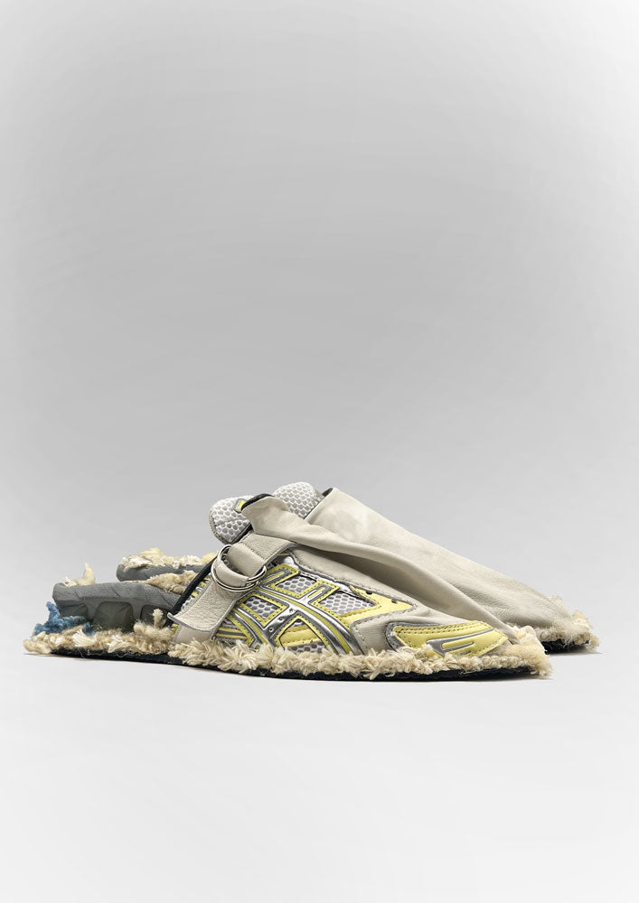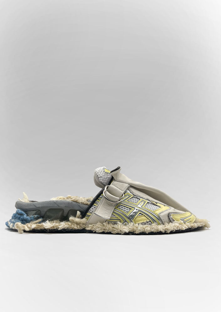 A SHATTERED DESTRUCTION OF ASICS WITHIN A BABOUCHE SHAPE THAT HAS BEEN HANMADE REWORKED WITH HERITAGE WEAVING.