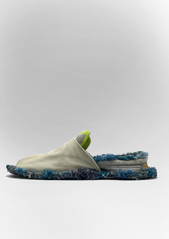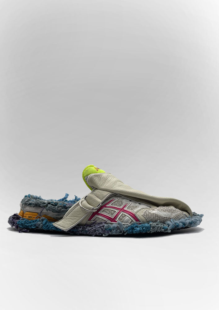 A SHATTERED DESTRUCTION OF ASICS WITHIN A BABOUCHE SHAPE THAT HAS BEEN HANMADE REWORKED WITH HERITAGE WEAVING.