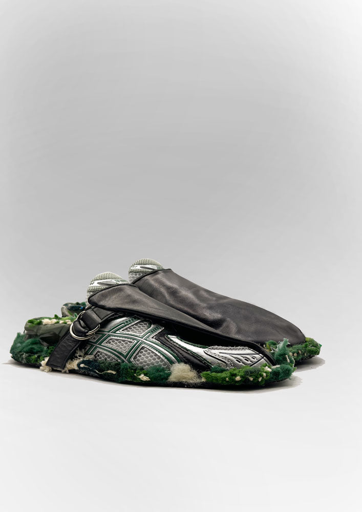 A SHATTERED DESTRUCTION OF ASICS WITHIN A BABOUCHE SHAPE THAT HAS BEEN HANMADE REWORKED WITH HERITAGE WEAVING.